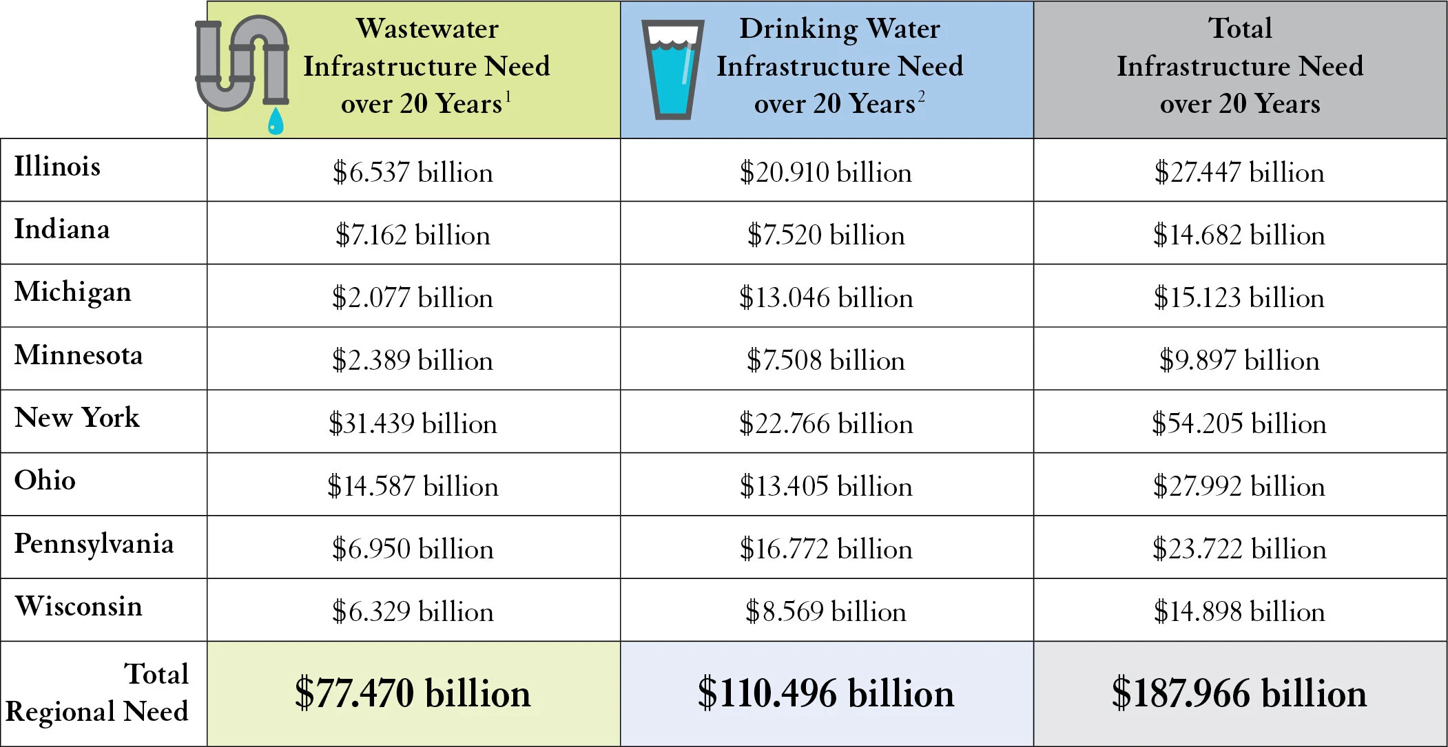 New investment is sorely needed. The Great Lakes states of Illinois, Indiana, Michigan, Minnesota, New York, Ohio, Pennsylvania, and Wisconsin face more than $188 billion in water infrastructure repairs and upgrades over 20 years to meet clean water objectives and to protect the health of local communities, according to the U.S. EPA.